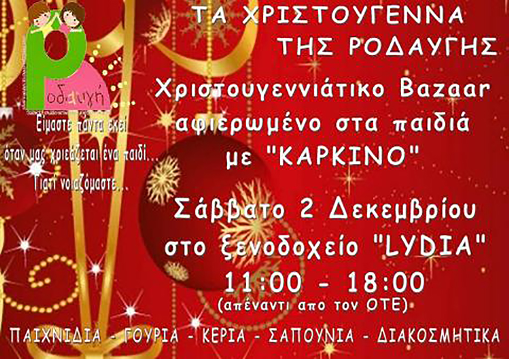 Ο Δωδεκανησιακός Σύλλογος Γονέων Και Φίλων Παιδιών που χρήζουν μεταμόσχευσης μυελού των οστών «Ροδαυγή» διοργανώνει και φέτος Χριστουγεννιάτικο Παζάρι για την ενίσχυση του συλλόγου.