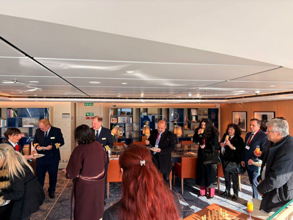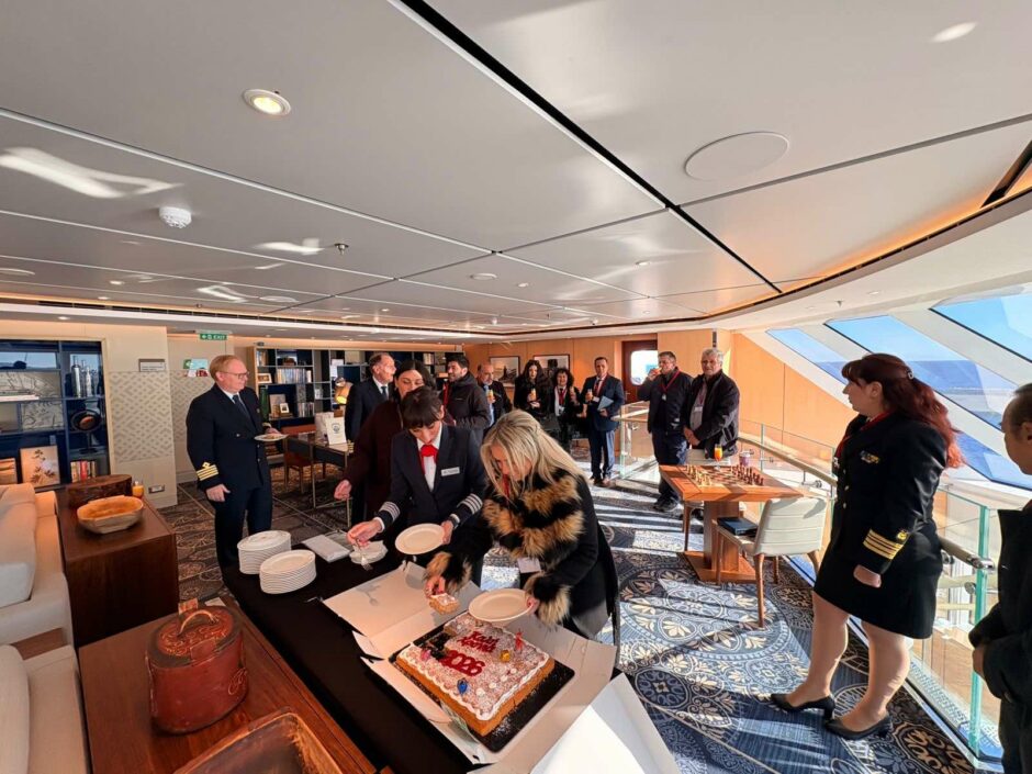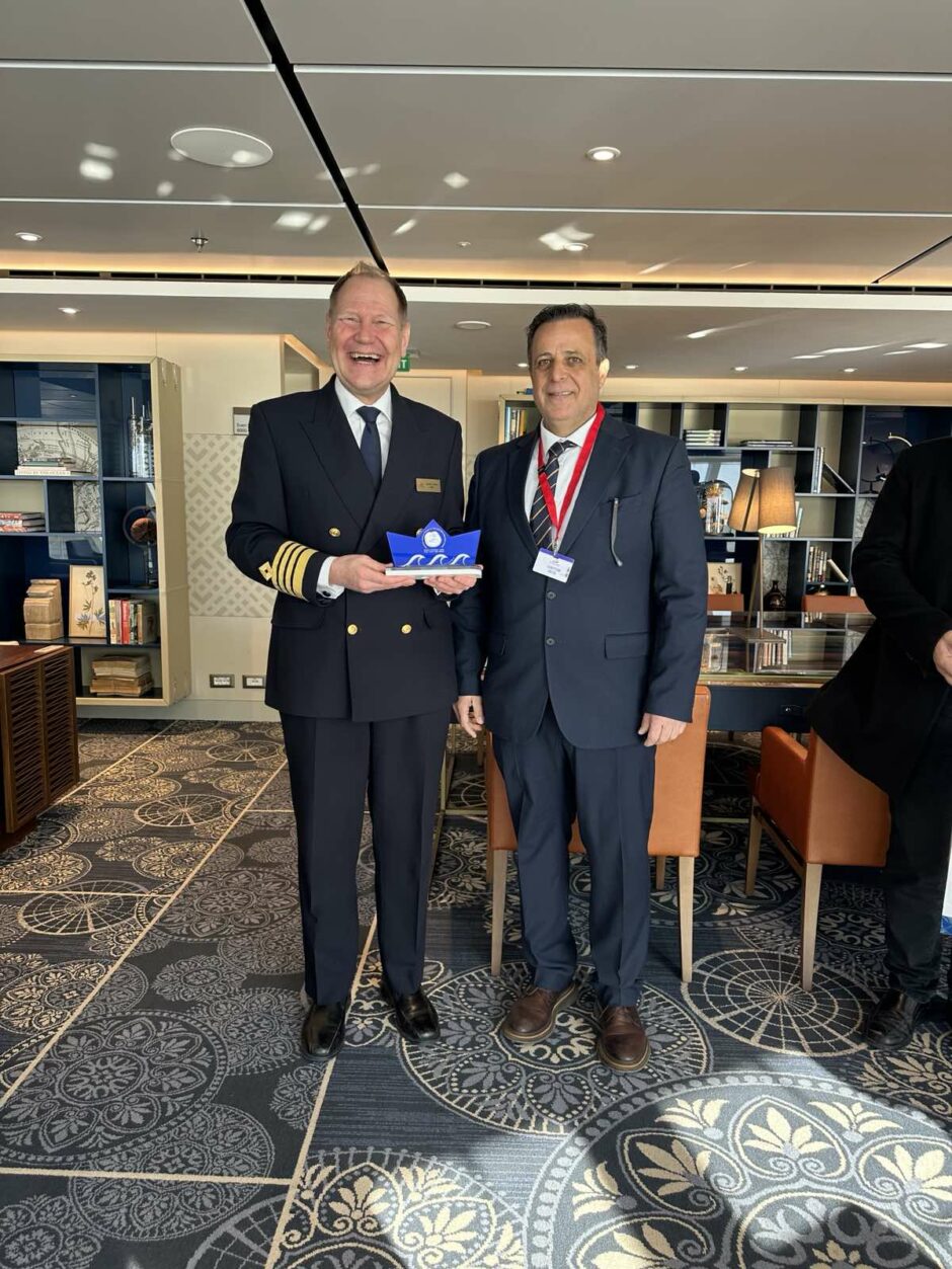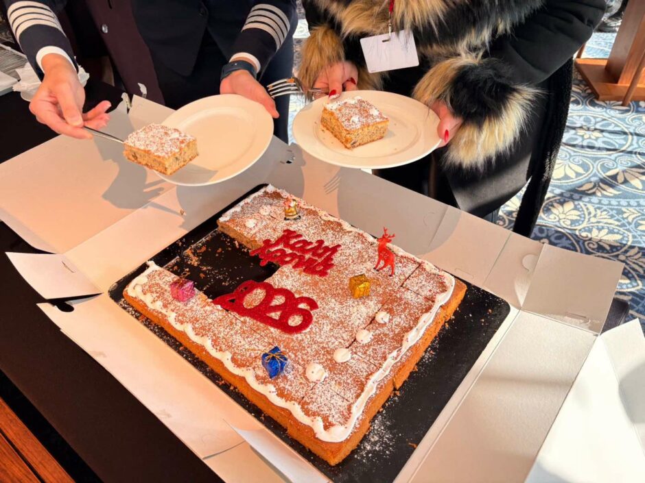 Ο πρόεδρος του Δημοτικού Λιμενικού Ταμείου Ν. Δωδεκανήσου Βασίλης Βαγιανάκης και ο αντιδήμαρχος Επικοινωνίας Γιώργος Πάττας αντάλλαξαν αναμνηστικές πλακέτες και δώρα με τον πλοίαρχο του κρουαζιερόπλοιου, Anders Gillis Steen. Ακολούθησε κοπή βασιλόπιτας, προσφορά του κ. Γεωργιάδη, με το φλουρί να κερδίζει ο ύπαρχος του πλοίου Rolf Fredrik Malmberg, στον οποίο προσφέρθηκε αναμνηστικό δώρο.