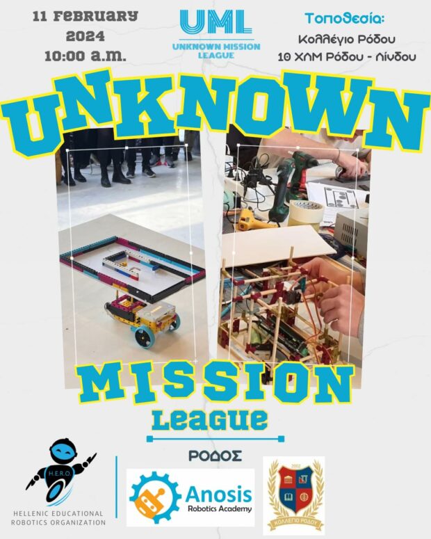 H Anosis Robotics Academy διοργανώνει για πρώτη φορά στη Ρόδο, τον Πανελλήνιο διαγωνισμό άγνωστης αποστολής UML UNKNOWN MISSION LEAGUE του Οργανισμού Εκπαιδευτικής Ρομποτικής H.E.R.O.