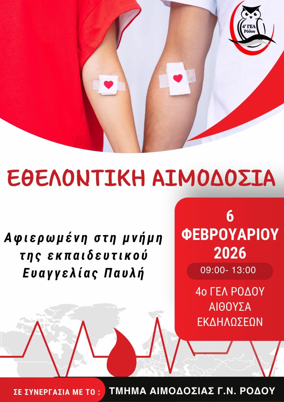 Η αιμοδοσία θα πραγματοποιηθεί την Παρασκευή 6 Φεβρουαρίου, από 09:00 έως 13:00, στην αίθουσα εκδηλώσεων του 4ου ΓΕΛ Ρόδου.