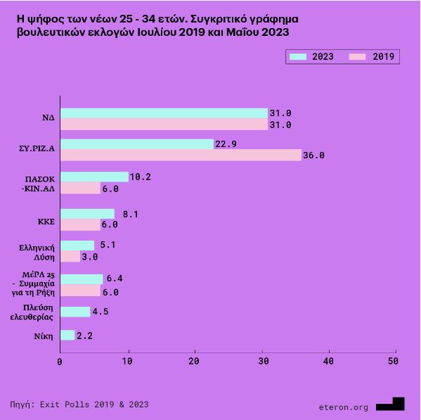 Ιδιαίτερο ενδιαφέρον παρουσιάζει η συγκριτική καταγραφή των εκλογικών αποτελεσμάτων στη νέα γενιά, όπως προκύπτουν από τα exit polls στις βουλευτικές εκλογές του 2019 και του Μαΐου του 2023.