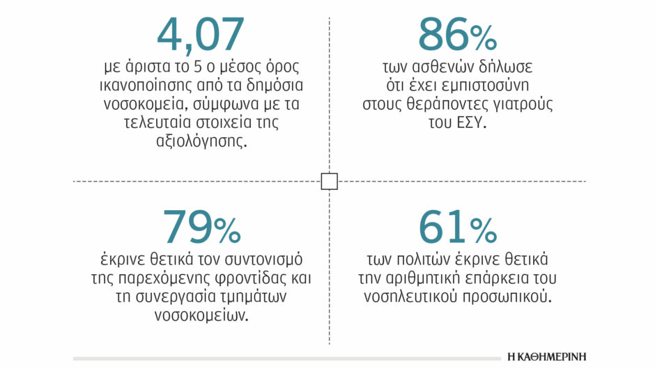 Το 79% έκρινε θετικά τον συντονισμό της παρεχόμενης φροντίδας και τη συνεργασία τμημάτων νοσοκομείων του ΕΣΥ. Εμπιστοσύνη στους θεράποντες ιατρούς έχει το 86% των ασθενών και στο νοσηλευτικό προσωπικό το 81%.