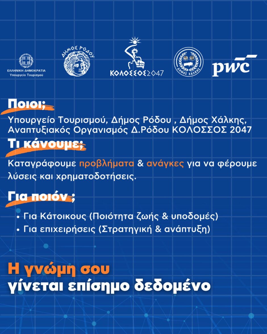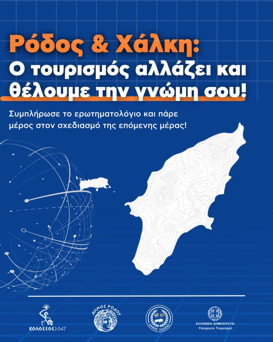 Καλούμε όλους τους κατοίκους και επιχειρηματίες της Ρόδου και της Χάλκης να αφιερώσουν λίγα λεπτά και να συμπληρώσουν τα ερωτηματολόγια, συμβάλλοντας ενεργά στη διαμόρφωση του τουριστικού μέλλοντος της περιοχής.