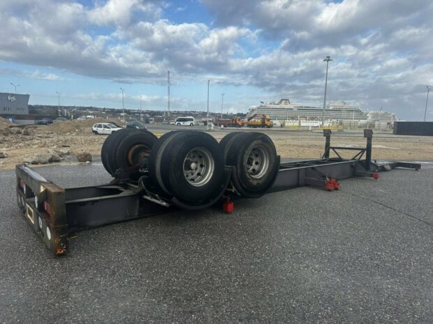Η μανία των ανέμων κατάφερε να ανατρέψει ακόμη και καρότσα φορτηγού πολλών τόνων, προοριζόμενη για τη μεταφορά κοντέινερ, στο λιμάνι της Ακαντιάς.