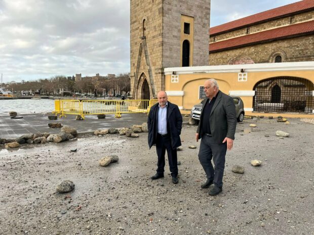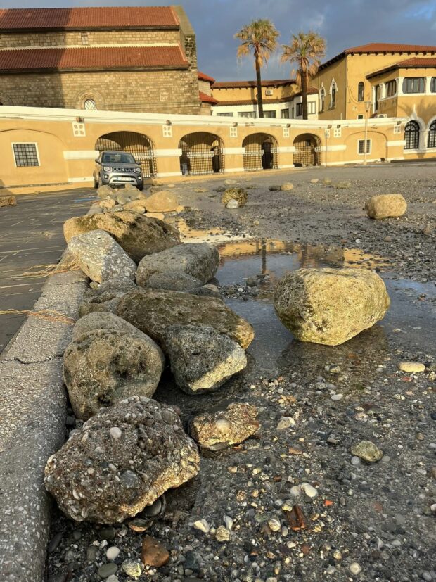 Ο κ. Καραντζιάς ανέφερε επίσης ότι βράχοι 100 και 200 κιλών ο καθένας βγήκαν από την θάλασσα στην πλατεία Κουντουριώτη πίσω από τον Ευαγγελισμό και το Περιφερειακό Μέγαρο και απομακρύνθηκαν με μηχανήματα από το πρωί, ενώ εξέφρασε την ανησυχία του μήπως υπάρχει υποσκαφή στο παραλιακό σημείο και κινδυνεύσει υποχώρηση του οδοστρώματος. Για τον λόγο αυτό τόνισε ότι θα φροντίσει ώστε με τις συναρμόδιες υπηρεσίες να σταλεί δύτης για να ελέγξει την κατάσταση ώστε να μην κινδυνεύσει κανένα διερχόμενο από το σημείο, αν υποχωρήσει το έδαφος.