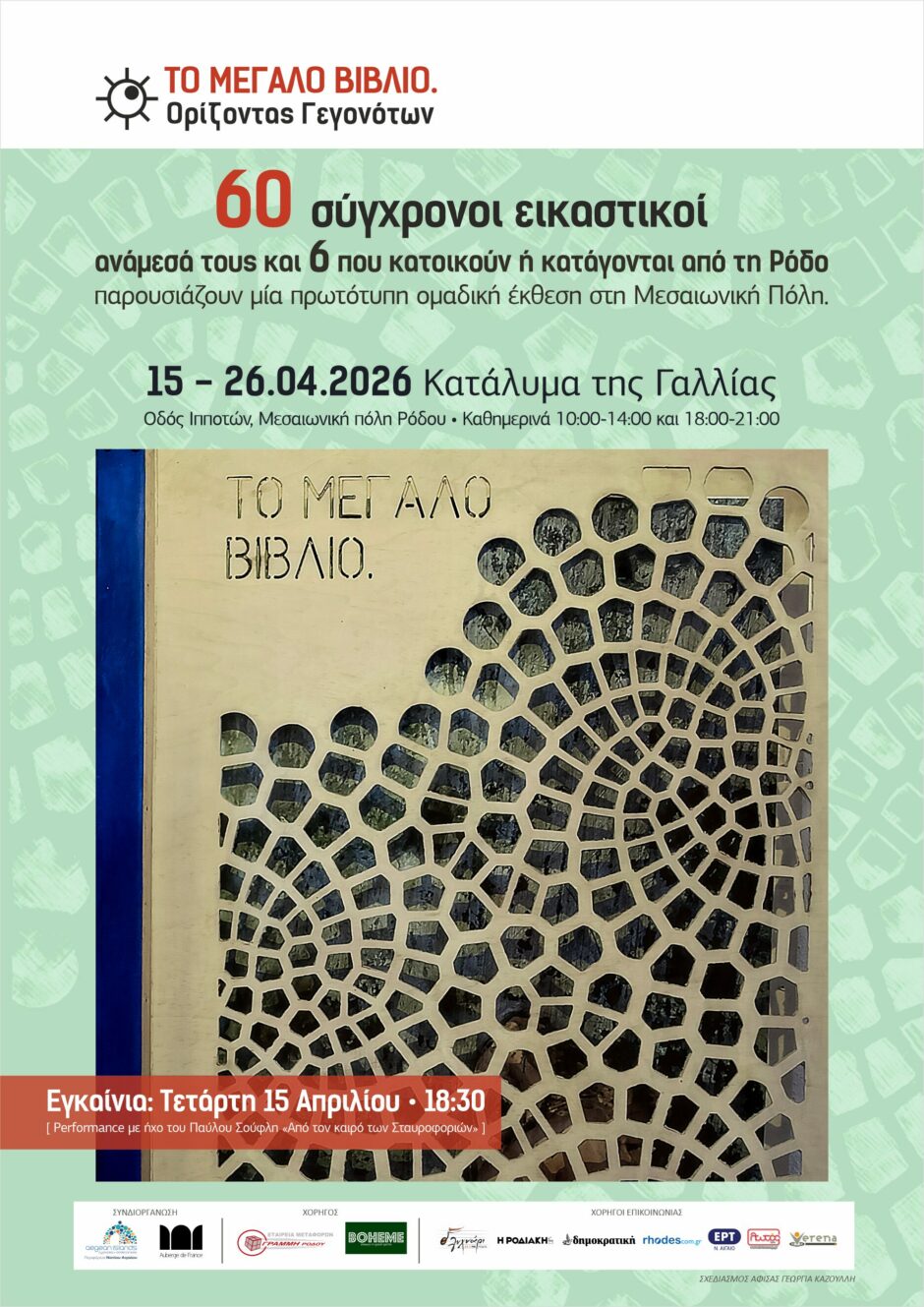 Ο Ορίζοντας Γεγονότων σας προσκαλεί στην πέμπτη έκθεση του «Μεγάλου Βιβλίου» με νέες συμμετοχές στις σελίδες του. Το «Μεγάλο Βιβλίο» είναι ένα πειραματικό, συλλογικό εγχείρημα εγκατάστασης ενός «μέγα-βιβλίου», που πιάνει το νήμα της παράδοσης των εικαστικών βιβλίων (artists’ books).