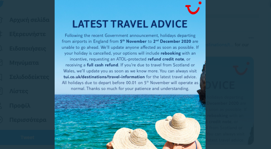 «Σε συνέχεια της πρόσφατης κυβερνητικής ανακοίνωσης, οι αναχωρήσεις για διακοπές από αεροδρόμια της Αγγλίας από τις 5 Νοεμβρίου έως τις 2 Δεκεμβρίου του 2020 δεν μπορούν να προχωρήσουν. Θα ενημερώσουμε το συντομότερο δυνατόν όλους όσοι επηρεάζονται».