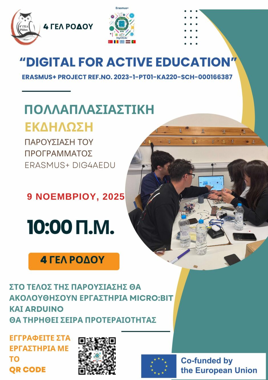 Το 4ο Γενικό Λύκειο Ρόδου προσκαλεί το κοινό στην Πολλαπλασιαστική Εκδήλωση (Multiplier Event) του ευρωπαϊκού προγράμματος Erasmus+ KA220-SCH “Digital for Active Education” (Dig4AEdu), η οποία θα πραγματοποιηθεί την Κυριακή, 9 Νοεμβρίου 2025, στην αίθουσα εκδηλώσεων του σχολείου.