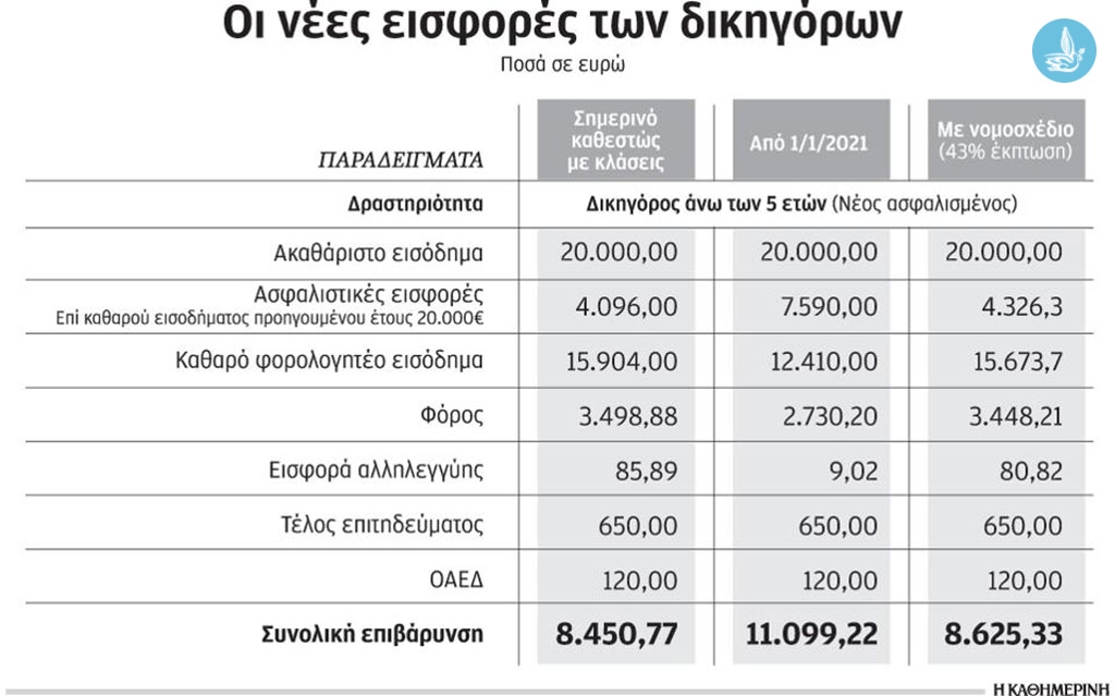 Διατάξεις εξοντωτικές για τους επιστήμονες, και δη τους δικηγόρους, περιλαμβάνει, σύμφωνα με την Ολομέλεια των Δικηγορικών Συλλόγων της χώρας, το ασφαλιστικό νομοσχέδιο που αναμένεται να εισαχθεί προς ψήφιση στην Ολομέλεια της Βουλής, την ερχόμενη Δευτέρα. «Υπό τον μανδύα της φερόμενης ασφαλιστικής μεταρρύθμισης, εισάγονται φορολογικού χαρακτήρα ρυθμίσεις με απροκάλυπτα δημευτικό χαρακτήρα», υπογράμμισε ο πρόεδρος των δικηγόρων Βασίλης Αλεξανδρής από το βήμα της αρμόδιας επιτροπής της Βουλής, επισημαίνοντας ότι το νομοσχέδιο ουδεμία βιωσιμότητα παρέχει στο ασφαλιστικό σύστημα, ενώ απειλεί με οικονομική και επαγγελματική εξόντωση τους επιστήμονες και τους ελεύθερους επαγγελματίες. Ο κ. Αλεξανδρής παρέθεσε δύο ενδεικτικά παραδείγματα: του παλαιού δικηγόρου με εισόδημα 30.000 ευρώ, ο οποίος με το σημερινό καθεστώς πληρώνει εισφορές 3.800 ευρώ ετησίως, ενώ με το υπό ψήφιση νομοσχέδιο θα κληθεί να πληρώσει 11.385 ευρώ, αλλά και του δικηγόρου με εισόδημα 15.000 ευρώ, οι εισφορές του οποίου αυξάνονται από 3.450, που πληρώνει σήμερα ετησίως, σε 5.692 ευρώ.