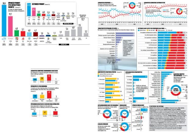 Παρά το γεγονός ότι στην πρόθεση ψήφου το προβάδισμα της ΝΔ έναντι του ΣΥΡΙΖΑ παραμένει σε διψήφια επίπεδα (30,8% έναντι 19,7%, με την αντίστοιχη εκτίμηση ψήφου να διαμορφώνεται στο 41,0% – 26,2%), οι αξιολογήσεις των επιδόσεων της κυβέρνησης και του Πρωθυπουργού εμφανίζονται αρνητικές σε όλα τα πεδία, με μοναδική εξαίρεση τον ψηφιακό μετασχηματισμό, όπου το 67% τον αξιολογεί θετικά, και τη φορολογία, όπου καταγράφεται μία αύξηση των θετικών γνωμών στο 39%, έναντι 34% του Ιουλίου.