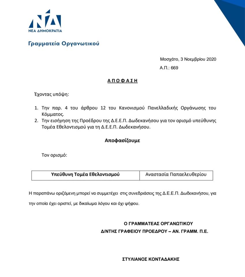 Με δύο αποφάσεις που εξέδωσε την 3η Νοεμβρίου 2020 ο γραμματέας του Οργανωτικού της Νέας Δημοκρατίας κ. Στυλιανός Κονταδάκης ορίστηκαν υπεύθυνη του τομέα πολιτισμού της ΔΕΕΠ Δωδεκανήσου του Κόμματος η κ. Μαρία Ευρυδίκη Πάλμου, υπεύθυνη γραφείων η κ. Ελένη Παπαϊωάννου και υπεύθυνη του τομέα Εθελοντισμού η κ. Αναστασία Παπαελευθερίου.