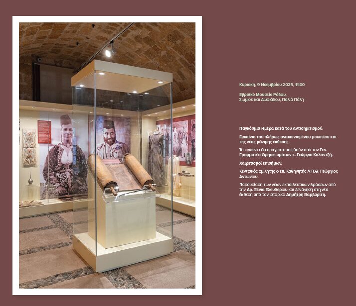 Η Ισραηλιτική Κοινότητα Ρόδου, σε συνεργασία με τη Γενική Γραμματεία Θρησκευμάτων έχουν την τιμή να σας προσκαλέσουν στις εκδηλώσεις που θα πραγματοποιήσει στις 7-9 Νοεμβρίου , με αφορμή την Παγκόσμια Ημέρα κατά του Αντισημιτισμού.