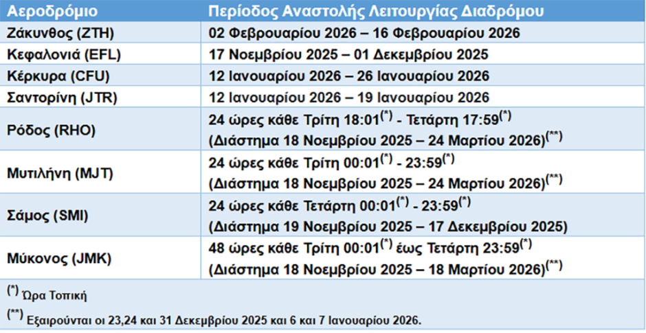 κριμένα, οι ημερομηνίες για την αναστολή λειτουργίας των διαδρόμων, ανά αεροδρόμιο, παρουσιάζονται στον παρακάτω Πίνακα: