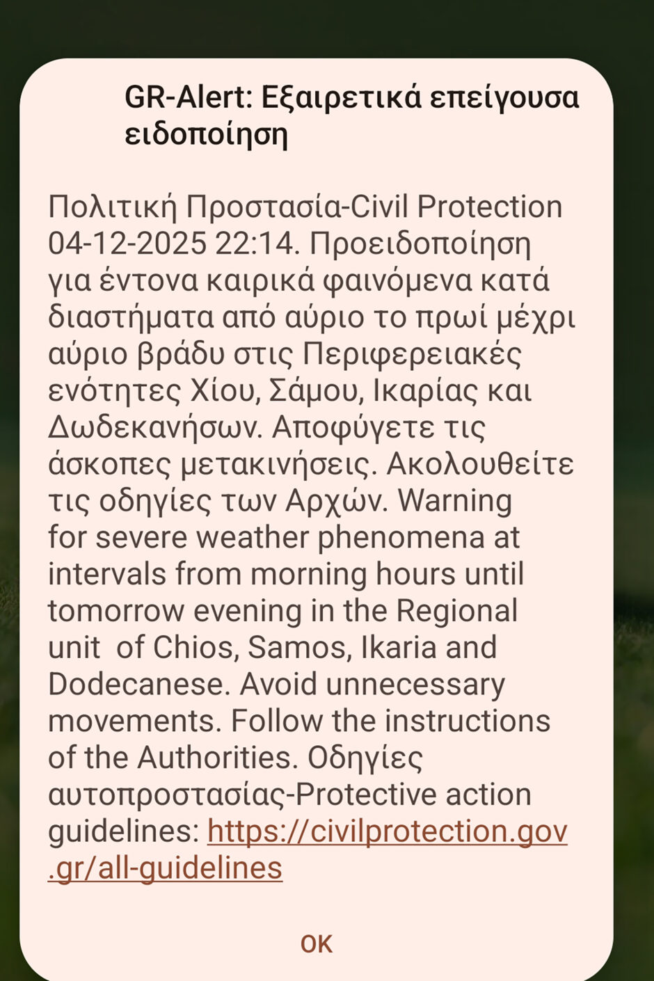 Για περισσότερες πληροφορίες και αναλυτικές οδηγίες προστασίας, οι πολίτες μπορούν να επισκέπτονται την ιστοσελίδα της Γενικής Γραμματείας Πολιτικής Προστασίας: www.civilprotection.gr.