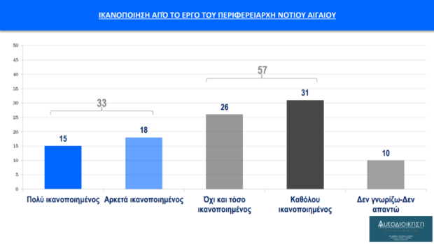 Ο περιφερειάρχης Νοτίου Αιγαίου Γιώργος Χατζημάρκος, στην τρίτη θητεία του στο τιμόνι της Περιφέρειας, συγκεντρώνει ποσοστό 33% θετικών αξιολογήσεων, με τους πολίτες να δηλώνουν «πολύ» ή «αρκετά ικανοποιημένοι» από το έργο του. Η διατήρηση αυτού του επιπέδου αποδοχής σε βάθος δεκαετίας συνιστά ένδειξη αξιοσημείωτης σταθερότητας και αποτυπώνει μια σχέση εμπιστοσύνης που έχει διάρκεια στον χρόνο, υπερβαίνοντας τη φυσιολογική φθορά που επιφέρει η μακρόχρονη άσκηση διοίκησης.