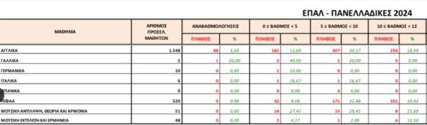 Το 41,86% των μαθητών έγραψαν κάτω από 10 ή 10 στο μάθημα των Αγγλικών, ενώ μόλις το 0,84% έγραψε πάνω από 18. Σημειώνεται ότι στο μάθημα των Αγγλικών εξετάστηκαν 1.548 μαθητές από ΕΠΑΛ.
