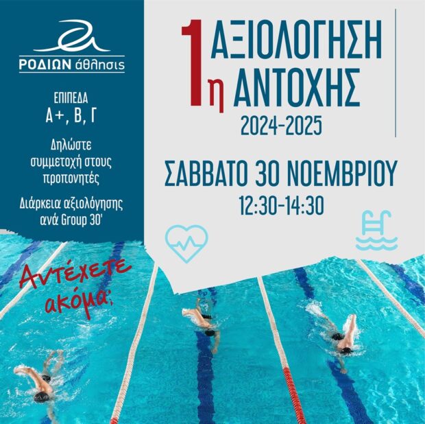 «Με μεγάλη συμμετοχή και απόλυτη επιτυχία ολοκληρώθηκε η πρώτη αξιολόγηση αντοχής των ακαδημιών κολύμβησης του ‘’Ροδίων Άθλησις’’, που πραγματοποιήθηκε στις 29 Νοεμβρίου 2025. Περισσότεροι από 60 αθλητές και αθλήτριες, ηλικίας 8 έως 16 ετών, από τα επίπεδα Α+, Β και Γ, έλαβαν μέρος χωρισμένοι σε τρία διαφορετικά γκρουπ.