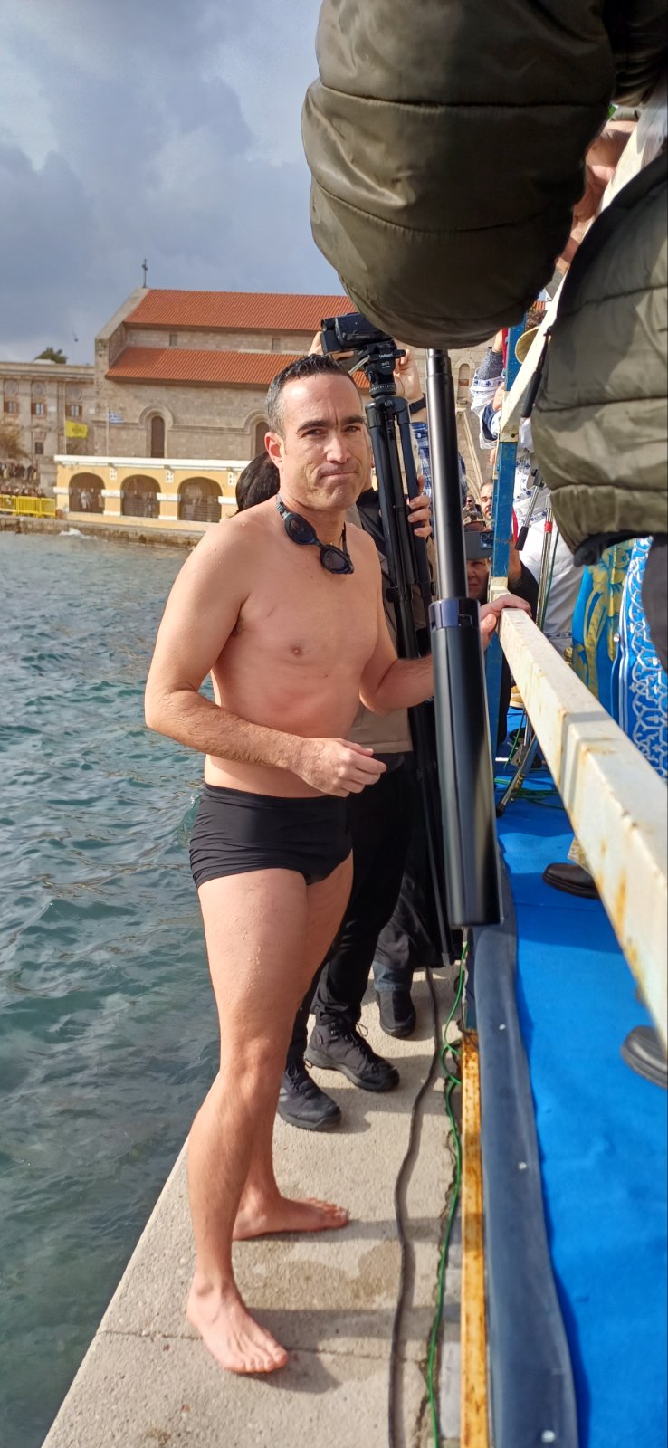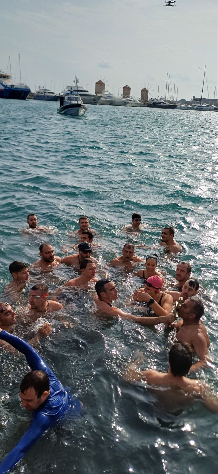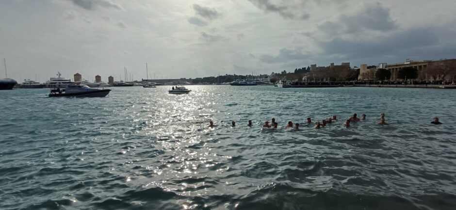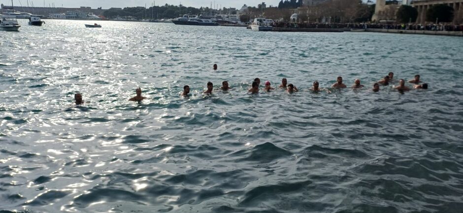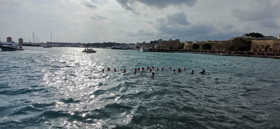 Μόλις ο Σεβασμιότατος Μητροπολίτης Ρόδου κ. Κύριλλος έριξε τον Τίμιο Σταυρό στη θάλασσα, βούτηξαν 17 κολυμβητές,