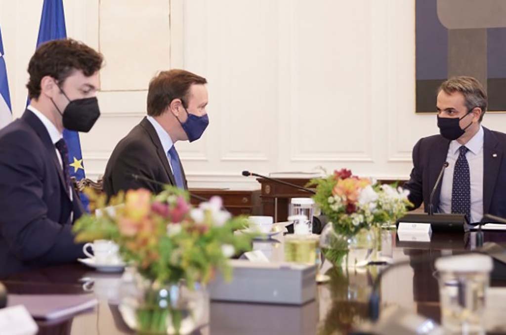 Περιφερειακά και διεθνή ζητήματα κοινού ενδιαφέροντος, με έμφαση στις εξελίξεις στην ευρύτερη περιοχή, την Ανατολική Μεσόγειο, τη Μέση Ανατολή, αλλά και την κατάσταση το Αφγανιστάν τέθηκαν επί τάπητος κατά τη σημερινή συνάντηση του πρωθυπουργού, Κυριάκου Μητσοτάκη με τους Αμερικάνους Γερουσιαστές, Κρίς Μέρφι (Chris Murphy) και Τζον Όσοφ (Jon Ossoff).