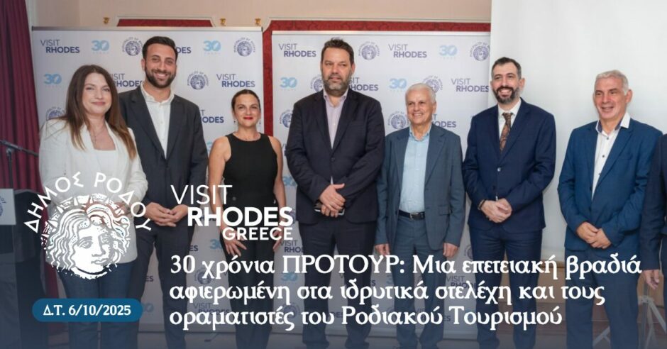 Ο Οργανισμός Προώθησης Ροδιακού Τουρισμού (ΠΡΟΤΟΥΡ), ένας πρότυπος και καινοτόμος φορέας που ένωσε τις δυνάμεις των τοπικών παραγόντων και συνέβαλε καθοριστικά στην τουριστική ανάπτυξη της Ρόδου, γιορτάζει τα 30 χρόνια από την ίδρυσή του. Το σημαντικό αυτό ορόσημο αποτέλεσε αφορμή για τον Δήμο Ρόδου και τη σημερινή Διοίκηση του ΠΡΟΤΟΥΡ να διοργανώσουν μια επετειακή εκδήλωση με σύνθημα: «Αγάπη για τη Ρόδο – Σεβασμός στο Παρελθόν – Ευθύνη για το Μέλλον».