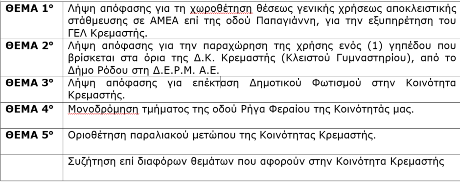 Για την Παρασκευή 9 Ιανουαρίου και ώρα 18.00 στο Δημοτικό Κατάστημα, έχει προγραμματιστεί η συνεδρίαση του συμβουλίου της Κοινότητας Κρεμαστής για τη συζήτηση στα παρακάτω θέματα της Ημερήσιας Διάταξης :