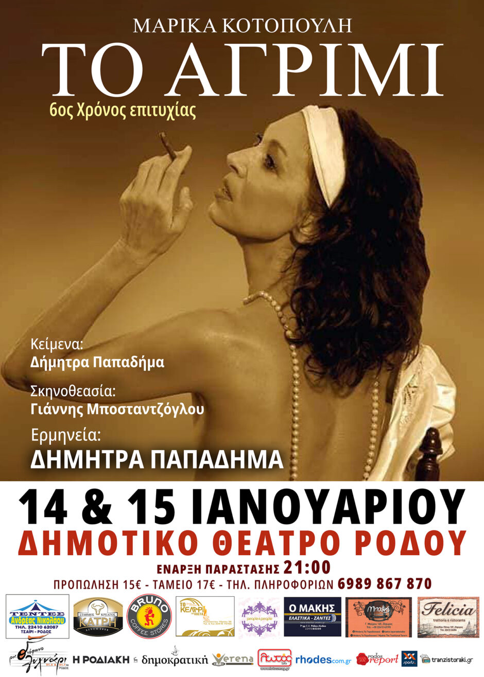 Η Μαρίκα Κοτοπούλη, η μεγάλη ιέρεια του θεάτρου, η παθιασμένη, η ασυμβίβαστη, η ελεύθερη γυναίκα, το γεννημένο «αγοροκόριτσο», το ΑΓΡΙΜΙ, μετά την μεγάλη της επιτυχία ανα την Ελλάδα έρχεται στη Ρόδο και τα λέει όλα έξω από τα δόντια. Μιλάει για τον μεγάλο και παθιασμένο της έρωτα με το Ίωνα Δραγούμη, τις αδυναμίες της, τα πάθη της, αυτοσαρκάζεται, καταριέται, βρίζει, πάσχει.