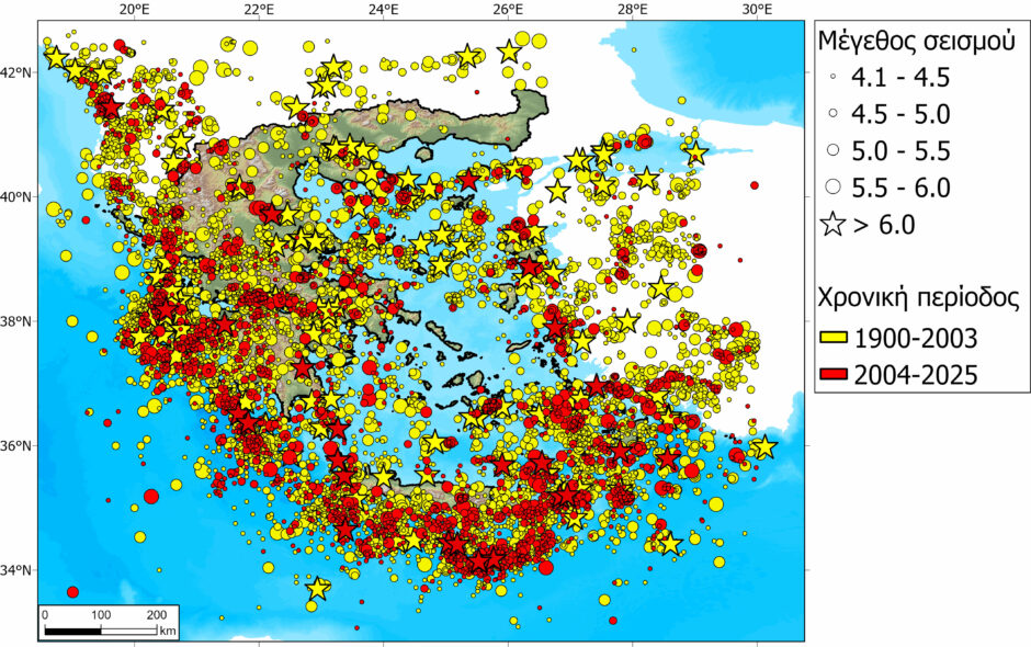 Επίκεντρα σεισμών (Μ>4) του ευρύτερου ελλαδικού χώρου από το 1900. Με κόκκινο χρώμα παρουσιάζονται τα επίκεντρα που εντοπίζονται από το 2004 και μετά και δεν είχαν ληφθεί υπόψη στον ισχύοντα Χάρτη Ζωνών Σεισμικής Επικινδυνότητας του ΕΑΚ. Πρόκειται για έναν από τους χάρτες που χρησιμοποιεί η ομάδα επιστημόνων για το έργο της επικαιροποίησης του κανονισμού.