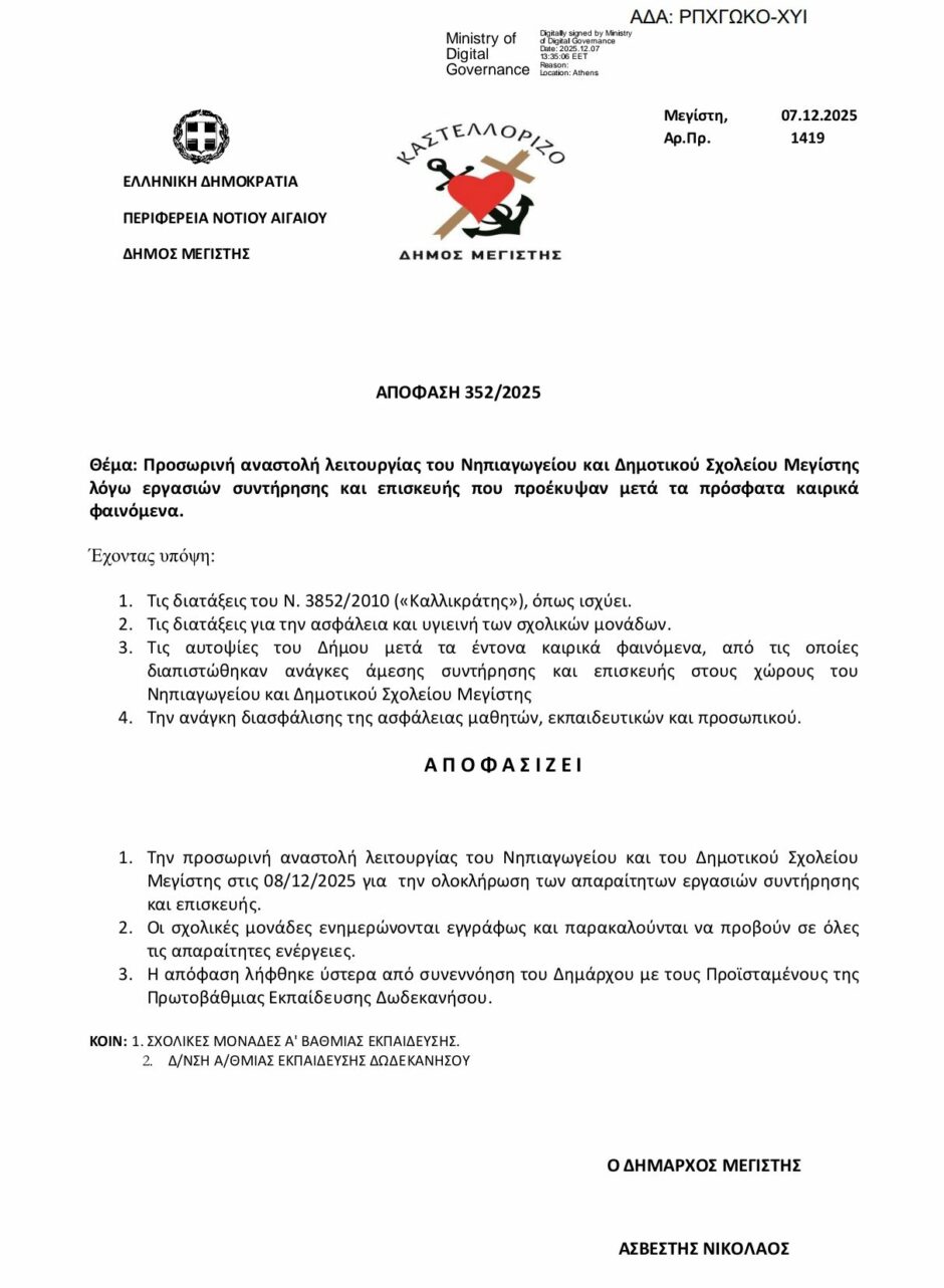Tην διακοπή λειτουργίας του νηπιαγωγείου και του δημοτικού σχολείου Μεγίστης προκειμένου να γίνουν οι απαραίτητες εργασίες επισκευής αποφάσισε ο δήμαρχος του νησιού κ. Νίκος Ασβέστης.