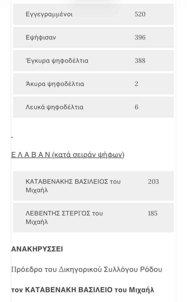 Η εκλογική διαδικασία στον Δικηγορικό Σύλλογο Ρόδου έφτασε στην κορύφωσή της με σαφή νικητή και καθαρό μήνυμα από το σώμα των μελών. Η εφορευτική επιτροπή ανακοίνωσε την περάτωση της διαλογής των ψηφοδελτίων του Β΄ γύρου και το αποτέλεσμα ανέδειξε νέο Πρόεδρο τον Βασίλειο Καταβενάκη. Η κάλπη σφράγισε μια αναμέτρηση που εξελίχθηκε σε πραγματικό ντέρμπι μετά τον οριακό Α΄ γύρο και επιβεβαίωσε ότι οι ισορροπίες κρίνονται σε λεπτομέρειες όταν το ενδιαφέρον των μελών παραμένει υψηλό.