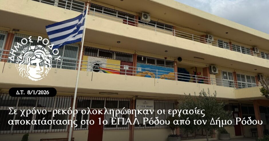 Σε χρόνο-ρεκόρ ολοκληρώθηκαν από τον Δήμο Ρόδου οι εργασίες αποκατάστασης των μπαλκονιών και αντικατάστασης των κιγκλιδωμάτων στο 1ο ΕΠΑΛ Ρόδου, έργο που αποτελούσε πάγιο αίτημα της σχολικής κοινότητας και παρέμενε σε εκκρεμότητα για πολλά χρόνια.