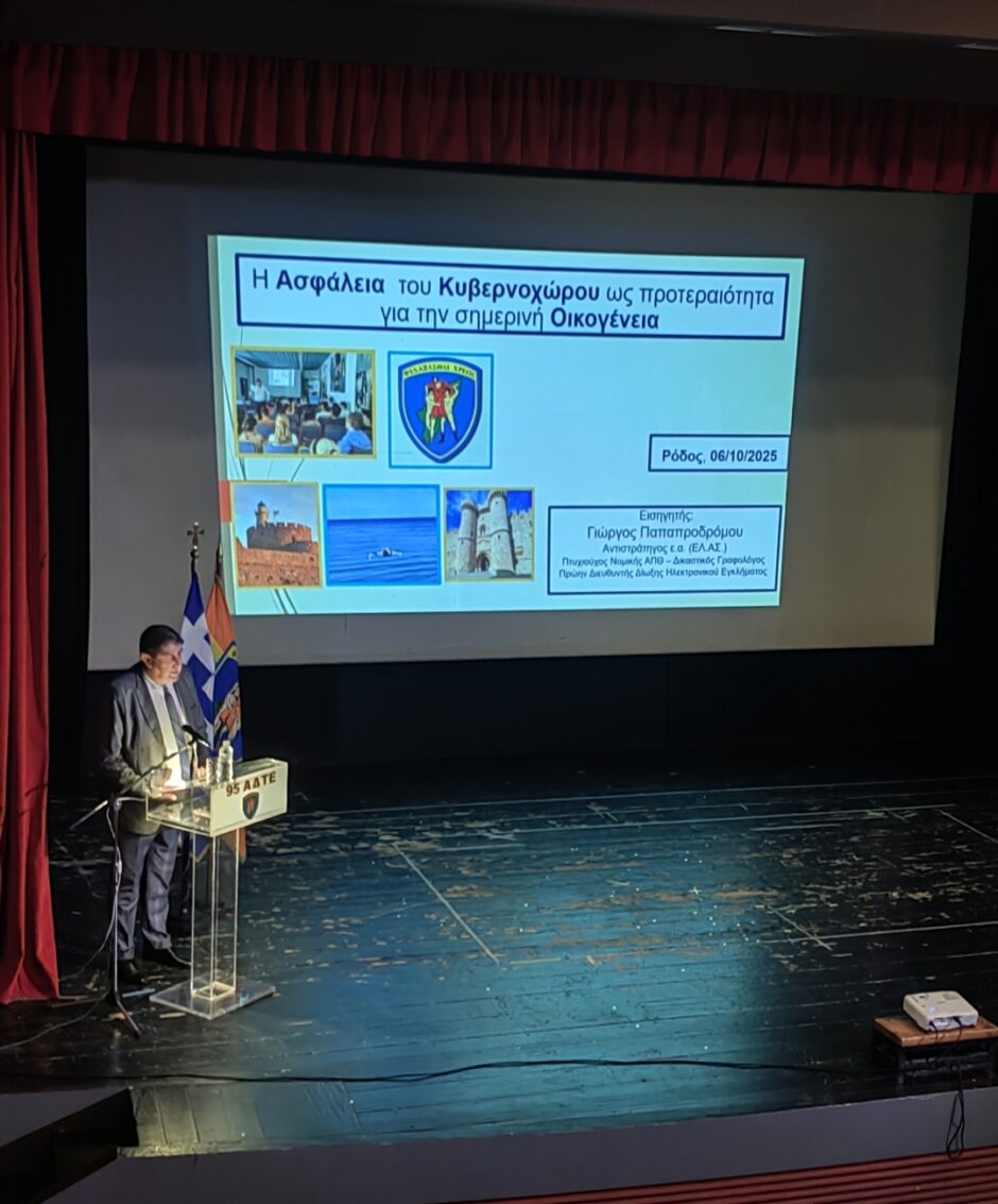 Πρωτοβουλία της 95 ΑΔΤΕ στο πλαίσιο του Έτους Δράσεων για την Οικογένεια του ΓΕΣ. Πιο συγκεκριμένα τη Δευτέρα 6 Οκτωβρίου 2025, στο Δημοτικό Θέατρο Ρόδου, πραγματοποιήθηκε με ιδιαίτερη επιτυχία ομιλία με θέμα «Κυβερνοασφάλεια και Ασφαλής Πλοήγηση στο Διαδίκτυο», με πρωτοβουλία της 95 Ανώτερης Διοίκησης Ταγμάτων Εθνοφυλακής (95 ΑΔΤΕ), στο πλαίσιο του Έτους Δράσεων για την Οικογένεια που έχει ανακηρυχθεί από το Γενικό Επιτελείο Στρατού (ΓΕΣ).