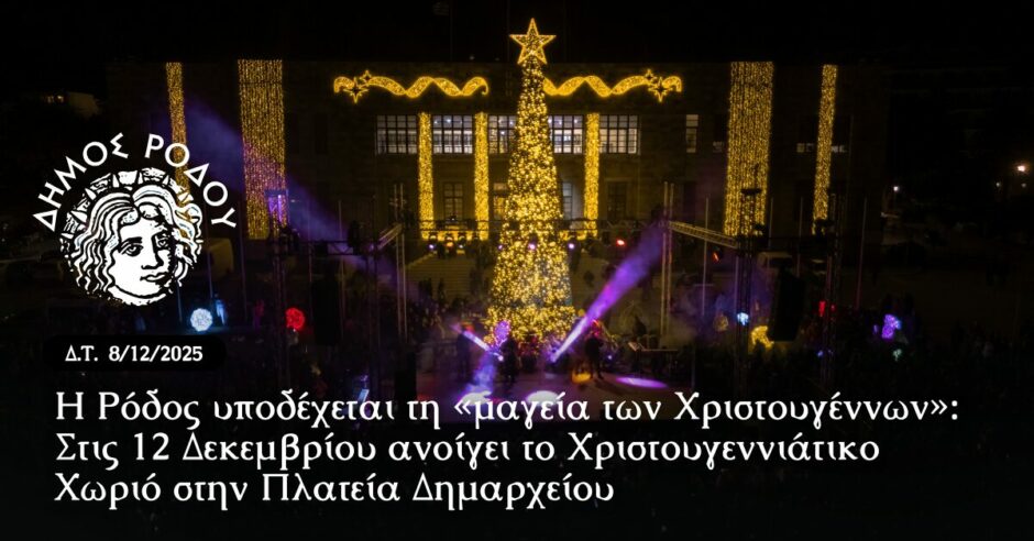 Η Ρόδος φορά τα γιορτινά της για να υποδεχθεί με λάμψη, χαρά και αισιοδοξία την εορταστική περίοδο των Χριστουγέννων και της Πρωτοχρονιάς. Την Παρασκευή 12 Δεκεμβρίου θα πραγματοποιηθεί η έναρξη λειτουργίας του Χριστουγεννιάτικου Χωριού, το οποίο φέτος “φιλοξενείται” στην Πλατεία Δημαρχείου. Ξύλινα σπιτάκια με ιδιαίτερες γαστρονομικές επιλογές, παιχνίδια για τα παιδιά, το παγοδρόμιο και ο γιορτινός διάκοσμος θα συνθέτουν έναν φιλόξενο χώρο, όπου μικροί και μεγάλοι θα μπορούν να απολαμβάνουν όμορφες στιγμές με ασφάλεια και χαρούμενη διάθεση.