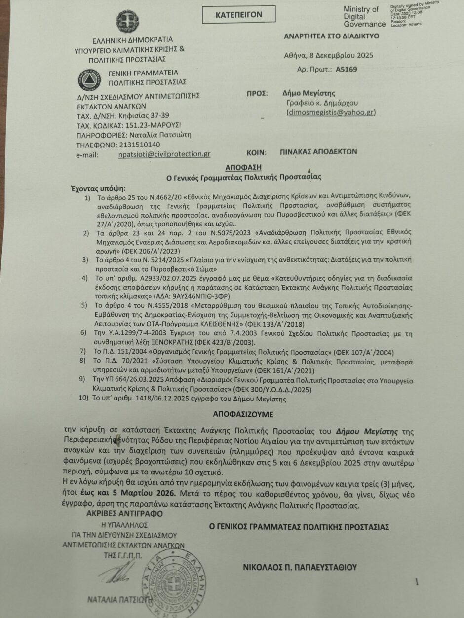 Μετά το αίτημα του Δήμου Μεγίστης σχετικά με τα ακραία καιρικά φαινόμενα, το νησί χθες Δευτέρα κηρύχθηκε σε κατάσταση Έκτακτης Ανάγκης Πολιτικής Προστασίας έως τις 5 Μαρτίου 2025.