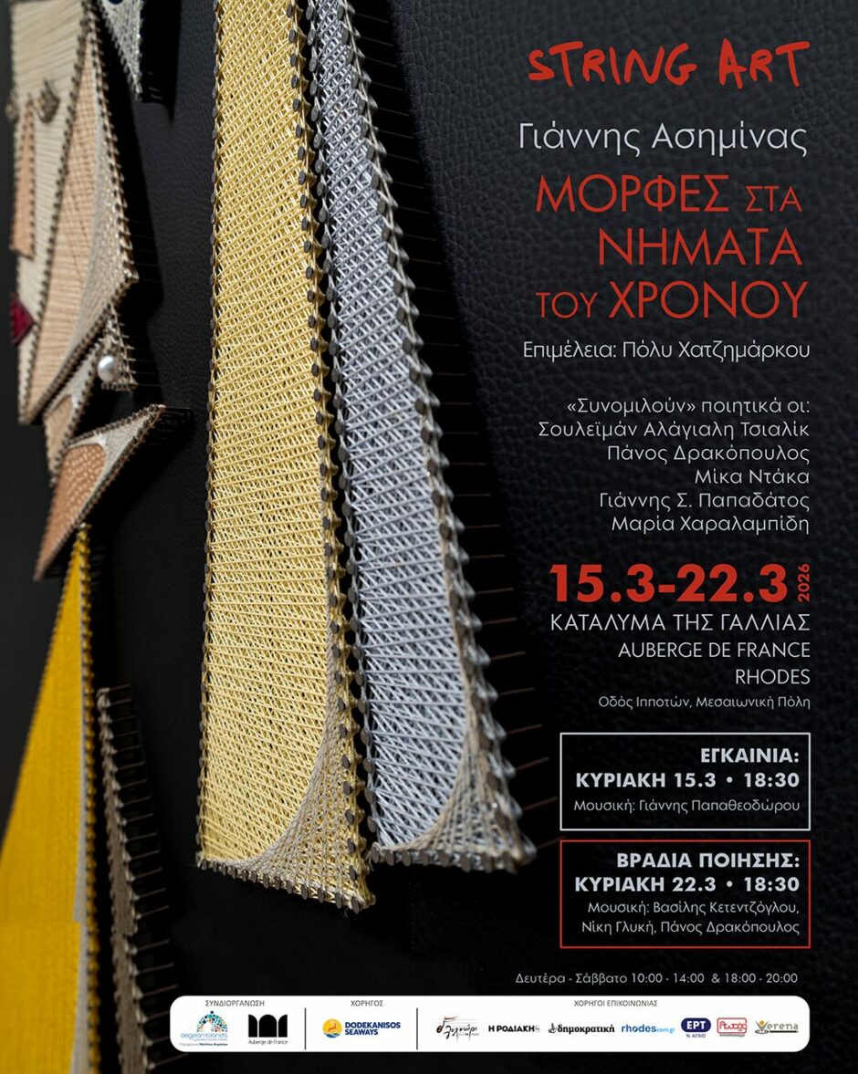 Το Κατάλυμα της Γαλλίας ανοίγει την αυλαία των φετινών εκδηλώσεων με την έκθεση string art του Γιάννη Ασημίνα με τίτλο «Μορφές στα νήματα του χρόνου» την Κυριακή 15 Μαρτίου 2026, ώρα 18.30