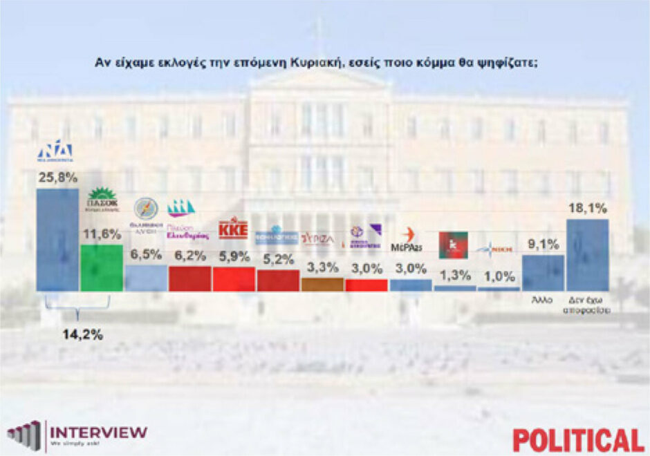 Πάνω από το 30% καταγράφει τη Νέα Δημοκρατία στην εκτίμηση εκλογικού αποτελέσματος δημοσκόπηση της Interview για την εφημερίδα Political.