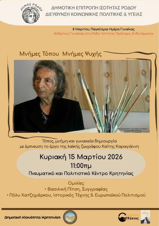 Την Κυριακή 15 Μαρτίου 2026 και ώρα 11:00, στο Πνευματικό και Πολιτιστικό Κέντρο Κρητηνίας, θα πραγματοποιηθεί η καλλιτεχνική παρουσίαση με τίτλο «Μνήμη Τόπου – Μνήμη Ψυχής», με τη συμμετοχή της συγγραφέως Βασιλικής Πίτση και της Πόλυς Χατζημάρκου, Ιστορικού Τέχνης και Ευρωπαϊκού Πολιτισμού, MSc Διοίκηση Πολιτισμικών Μονάδων και Ειδικής Συμβούλου Δημάρχου Ρόδου σε θέματα πολιτισμού.