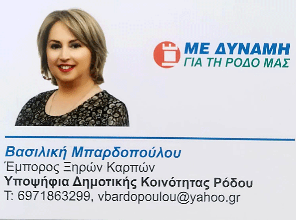 Σε μια εποχή, όπου η ανάγκη επιβίωσης κρίνεται ώς βασική προϋπόθεση για το μέλλον του τόπου και της καθημερινότητάς μας. Διαθέτοντας πλήρη επίγνωση ώς απλή πολίτης του νησιού μας σχετικά με την ορθή λογική προσέγγισης της επίλυσης απλών και πιο σύνθετων ζητημάτων που μας αφορούν. Θεωρώ ότι, ο Δήμος μας χρειάζεται μια πιο δυναμική και ελπιδοφόρα παρουσία , που θα συμβάλει επι της ουσίας και χωρίς πολλά ευχολόγια της τελευταίας στιγμής , στην ριζική αναδιοργάνωση του τόπου μας για μια Πόλη , κόσμημα, όπως της αξίζει. Αυτό βρήκα στο πρόσωπο του Υποψήφιου Δημάρχου της Ρόδου κ. Αντώνη Καμπουράκη, του οποίου αποδέχθηκα με τιμή την πρόταση του να είμαι Υποψήφια Σύμβουλος , της Δημοτικής κοινότητας ( Τοπικό ) Ρόδου.
