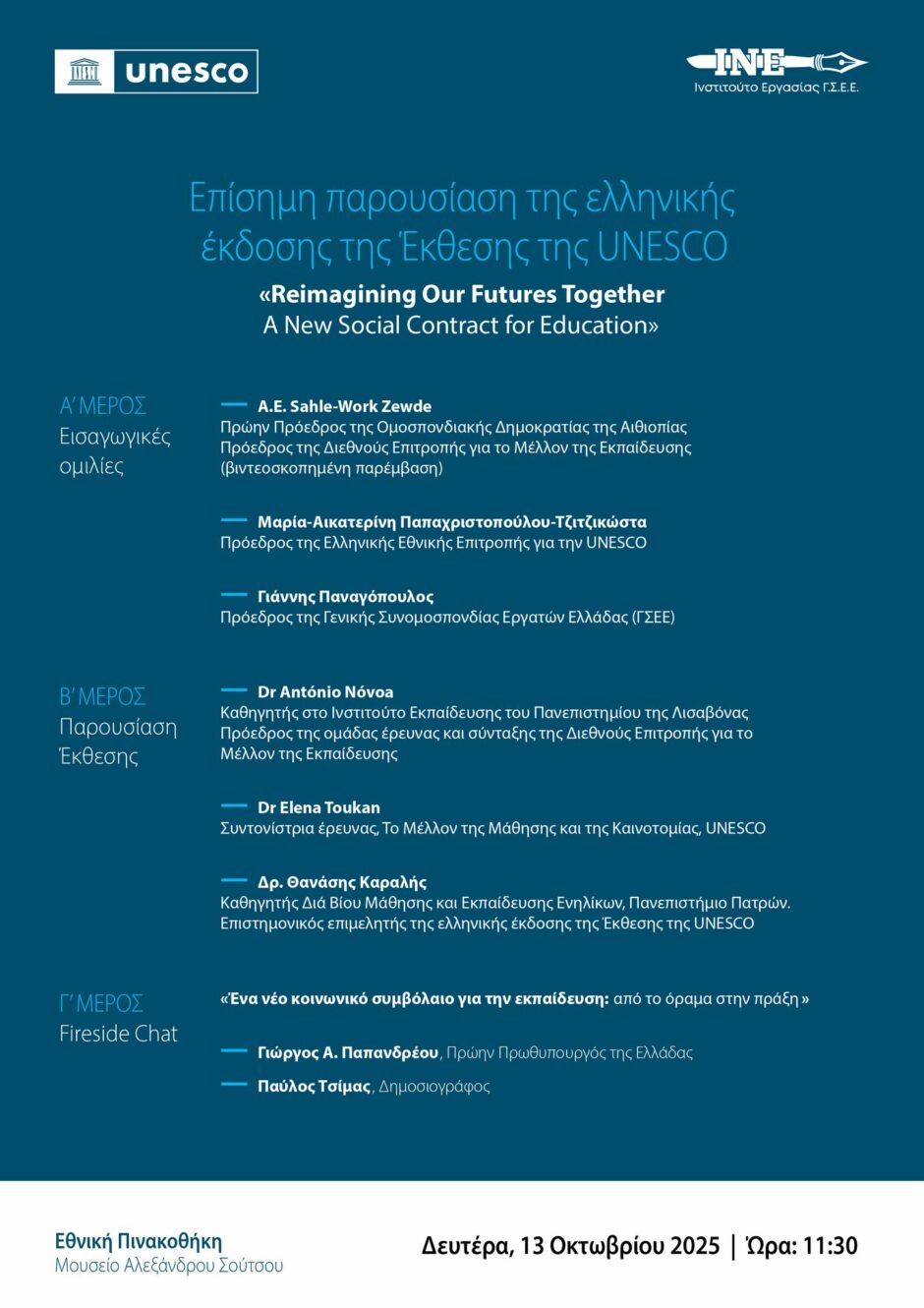 Τη Δευτέρα, 13/10 και ώρα 11:30 στην Εθνική Πινακοθήκη παρουσιάζεται η έκδοση-έκθεση της UNESCO με την επιστημονική επιμέλεια του ΙΝΕ-ΓΣΕΕ. Τίτλος, «Ας Οραματιστούμε και Πάλι το Μέλλον μας Μαζί: Ένα Νέο Κοινωνικό Συμβόλαιο για την Εκπαίδευση». Στόχος της έκθεσης, να καταδειχθεί ότι η εκπαίδευση είναι ένα από τα τελευταία όπλα της ανθρωπότητας για να αντιταχθεί στις σκοτεινές εποχές που ζούμε και να επιχειρήσει την κοινωνική αλλαγή για ένα μέλλον πιο δίκαιο και βιώσιμο για όλους.
