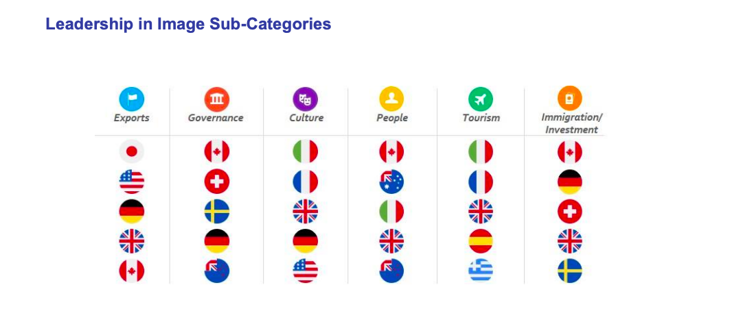 Συνολικά ως τοπ «Εθνικό Brand» σε όλες τις κατηγορίες αναδεικνύεται η Γερμανία και ακολουθούν Ηνωμένο Βασίλειο, Καναδάς, Ιαπωνία, Γαλλία, Ιταλία, Ελβετία, Αυστραλία, Σουηδία και ΗΠΑ. Το Ηνωμένο Βασίλειο καταγράφει φέτος την καλύτερη επίδοσή του στο δείκτη που μετρά τη φήμη των κρατών, η Γαλλία πέφτει τρείς θέσεις (από τη δεύτερη το 2019 στην πέμπτη το 2020), ενώ οι ΗΠΑ πέφτουν από την 6η θέση πέρυσι στη 10η θέση φέτος. Η Γερμανία κατέχει σταθερά την πρώτη θέση από το 2017 μέχρι σήμερα, ενώ πέραν των ΗΠΑ, μεγάλη πτώση φέτος, εν μέσω πανδημίας όπως επισημαίνεται στη μελέτη, καταγράφει και η Κίνα, η οποία από την 23η θέση του 2019 έπεσε φέτος στην 35η θέση.
