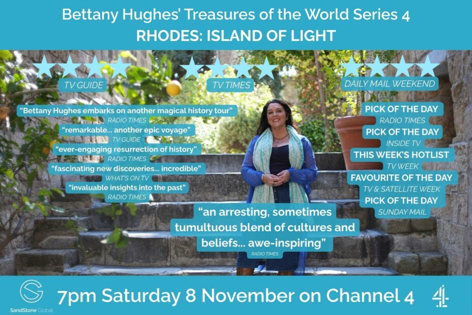 Η διάσημη ιστορικός, συγγραφέας και τηλεοπτική παραγωγός Bettany Hughes, γνωστή για τη βραβευμένη σειρά ντοκιμαντέρ «Treasures of the World» («Θησαυροί του Κόσμου»), που προβάλλεται στο Channel 4 του Ηνωμένου Βασιλείου, καθώς και σε περισσότερα από 120 τηλεοπτικά δίκτυα και στη συνδρομητική πλατφόρμα Apple TV, παρουσίασε το Σάββατο 8 Νοεμβρίου 2025, το νέο της επεισόδιο αφιερωμένο στη Ρόδο, με τίτλο «Rhodes: Island of Light» («Ρόδος: το Νησί του Φωτός»).