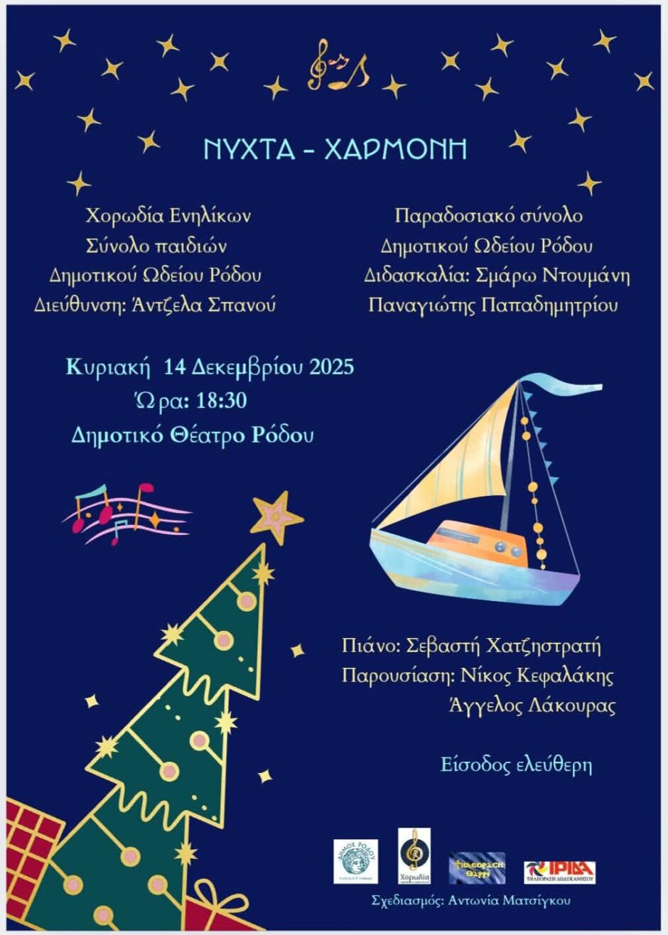 Χριστουγεννιάτικη συναυλία, όπου οι χορωδίες και το παραδοσιακό σύνολο του Δημοτικού Ωδείου Ρόδου ενώνουν τις φωνές και τους ήχους τους σε ένα εορταστικό πρόγραμμα γεμάτο διεθνείς μελωδίες, κάλαντα και μουσικές του τόπου μας.