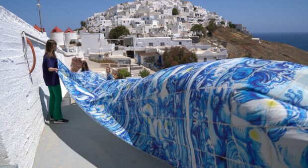 Στο επίκεντρο ένα εντυπωσιακό φόρεμα μήκους 20 μέτρων, εμπνευσμένο από την τέχνη των πορτογαλικών azulejos – τα περίτεχνα κεραμικά πλακάκια που αφηγούνται ιστορίες με χρώμα και ρυθμό. Το ύφασμα μετατράπηκε σε κινούμενο έργο τέχνης από τη σχεδιάστρια μόδας Μαρία Βυτινίδου, το οποίο ανέδειξε φορώντας το η πιανίστρια Έλενα Ξυδιά, ερμηνεύοντας μουσικά κομμάτια στα πιο μαγευτικά τοπία Ελλάδας και Πορτογαλίας. Στην Αστυπάλαια, με φόντο το Αιγαίο. Στο Κασκάις και στο Κάμπο ντα Ρόκα με την πλάτη στον Ατλαντικό. Σε κάθε της νότα, το φόρεμα ανέμιζε σαν σημαία που υπερασπίζεται το αύριο. Έντυσε το σώμα και τη δράση με ήχο, δίνοντας πνοή και συγκίνηση.