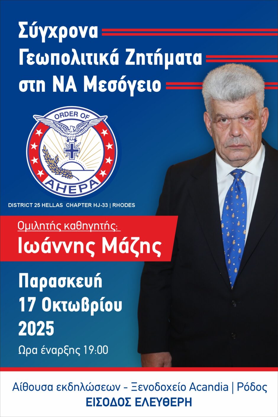 “Σύγχρονα Γεωπολιτικά Ζητήματα στη ΝΑ Μεσόγειο” την Παρασκευή 17 Οκτωβρίου 2025 και ώρα έναρξης 19:00. Η εκδήλωση θα ξεκινήσει στις 19:00 και θα διεξαχθεί στην αίθουσα εκδηλώσεων του ξενοδοχείου ACANDIA στη Ρόδο οδός Ηρώων Πολυτεχνείου 6 με ελεύθερη είσοδο.