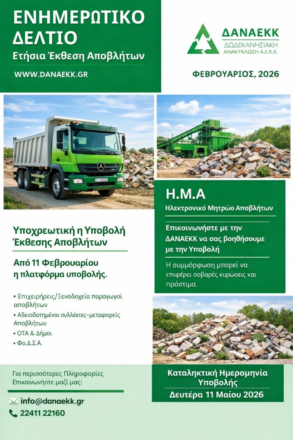 Η ΔΑΝΑΕΚΚ υπενθυμίζει σε όλες τις υπόχρεες επιχειρήσεις, οργανισμούς και φορείς ότι η υποβολή της Ετήσιας Έκθεσης Αποβλήτων στο Ηλεκτρονικό Μητρώο Αποβλήτων (ΗΜΑ) είναι υποχρεωτική, σύμφωνα με την ισχύουσα νομοθεσία.