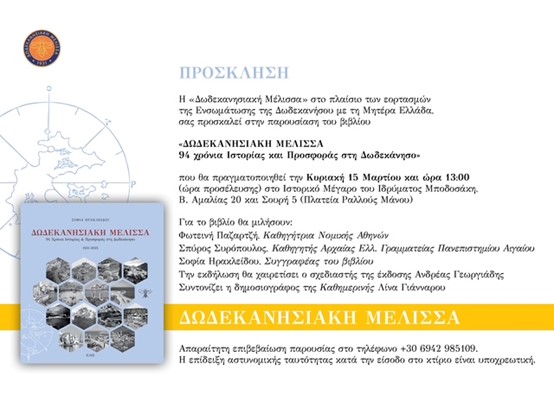 Την παρουσίαση του βιβλίου «Δωδεκανησιακή Μέλισσα – 94 χρόνια Ιστορίας και Προσφοράς στη Δωδεκάνησο» θα πραγματοποιήσει η  Δωδεκανησιακή Μέλισσα, στο πλαίσιο των εκδηλώσεων για την επέτειο της Ενσωμάτωσης της Δωδεκανήσου με τη Μητέρα Ελλάδα, την Κυριακή 15 Μαρτίου στο ιστορικό Μέγαρο Μποδοσάκη, στην Αθήνα.
