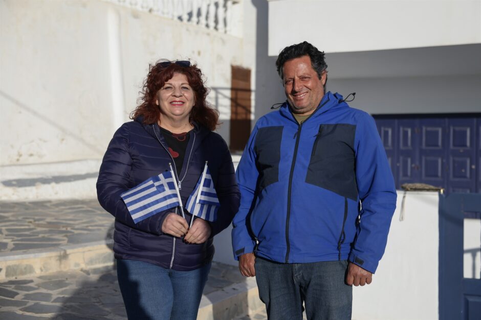 «Ετοιμαζόμαστε για την ειρήνη». Η Φωτεινή Φράγκου, κάτοικος Καρπάθου, με τον αντιδήμαρχο Εμμανουήλ Σαΐτη. Η κ. Φράγκου λέει ότι δεν την ανησυχεί που είναι ακρίτισσα ούτε νιώθει κάποια απειλή. «Δεν πάμε για πόλεμο, απλώς ετοιμαζόμαστε για την ειρήνη», επισημαίνει από την πλευρά του ο κ. Σαΐτης. [ΑΛΕΞΑΝΔΡΟΣ ΑΒΡΑΜΙΔΗΣ]
