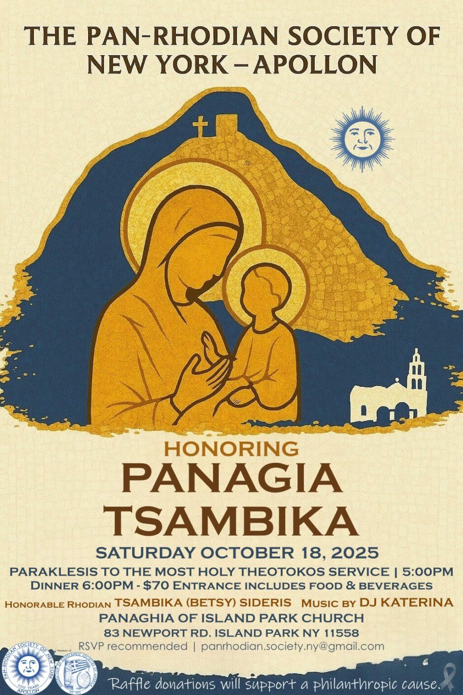 Στο πλαίσιο των εορτασμών για τα 100 χρόνια από την ίδρυση του, ο Σύλλογος Ρόδου Νέας Υόρκης «Απόλλων» διοργανώνει εκδήλωση αφιερωμένη στην Παναγία Τσαμπίκα, ένα από τα σημαντικότερα προσκυνήματα της Δωδεκανήσου και διαχρονικό σύμβολο πίστης, ελπίδας και ενότητας για όλους τους Ροδίτες.