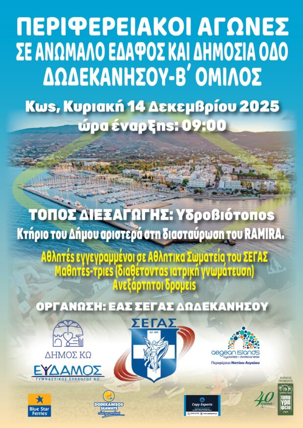 Την προσεχή Κυριακή 14 Δεκεμβρίου θα διεξαχθεί στην Κω ο πρώτος από τους δύο Περιφερειακούς Αγώνες ανωμάλου δρόμου (ο άλλος θα γίνει στη Ρόδο) για τη νέα αγωνιστική περίοδο στα Δωδεκάνησα, αποτελώντας και κριτήριο πρόκρισης για τη συμμετοχή στο Πανελλήνιο Πρωτάθλημα.