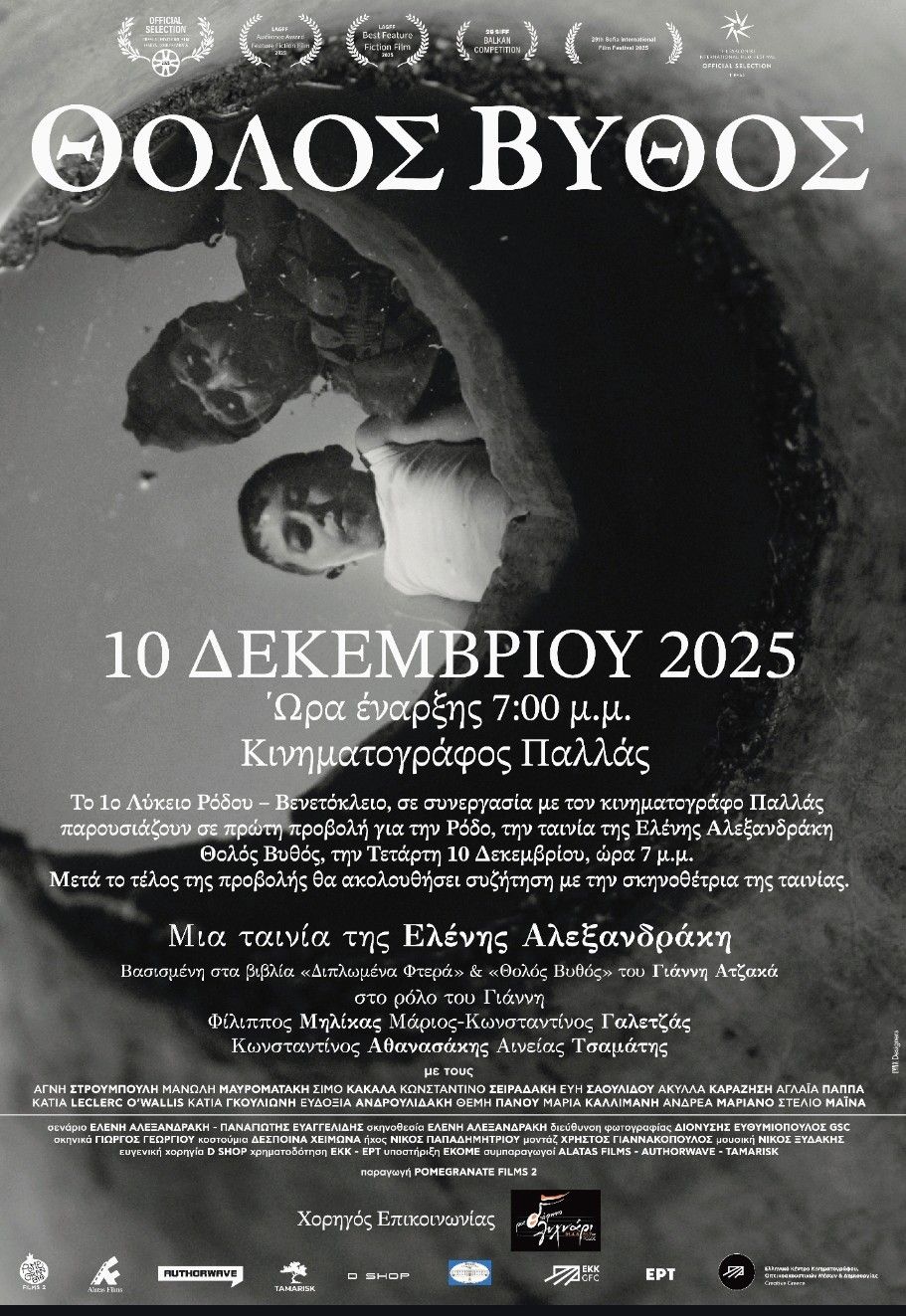 Με ιδιαίτερη επιτυχία και μεγάλη συμμετοχή ολοκληρώθηκε η πολιτιστική πρωτοβουλία του 1ου ΓΕΛ Ρόδου (Βενετόκλειο) την Τετάρτη 9 Δεκεμβρίου, με την προβολή της ταινίας «Θολός Βυθός» της διακεκριμένης σκηνοθέτιδας Ελένης Αλεξανδράκη στον κινηματογράφο «Παλλάς», με τη συμμετοχή της ίδιας της σκηνοθέτιδας.