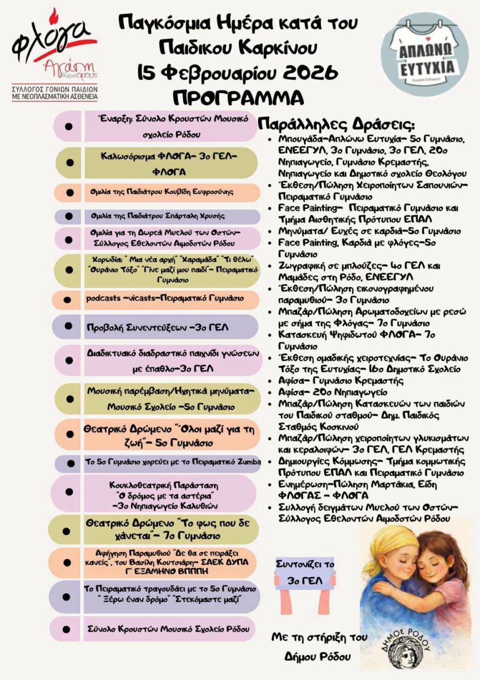 Πρόκειται για μια μεγάλη συνεργατική πρωτοβουλία της εκπαιδευτικής κοινότητας της Ρόδου, σε συνεργασία με τον Σύλλογο Γονιών Παιδιών με Νεοπλασματική Ασθένεια «Φλόγα» και με τη στήριξη του Δήμου Ρόδου.